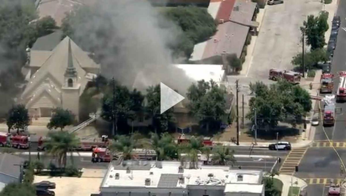 One firefighter was hospitalized and three others received medical care while battling a blaze at a one-story church in the San Fernando Valley Tuesday where ambient temperatures reached 105 degrees, authorities confirmed to KTLA. Crews with the Los Angeles Fire Department responded to reports of the structure fire at 1525 Glenoaks Blvd., near Harding Avenue in San Fernando just before 1 p.m., according to an LAFD news release. At the scene, firefighters worked to access hard-to-reach spaces and snuff out flames inside the attic of the approximately 7,000-square-foot church. Holes were cut in the decking of the rooftop, which had been under construction, so that crews could get streams of water into the attic.