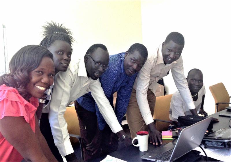 The Radio Community news and program editors at a training in Kampala, from left: Everlyne Losike of Singaita FM in Kapoeta; Angelina Achol from Mingkaman FM; Joseph Deng from Nhomlaau FM in Malualkon; Aguer Atem from Mayardit FM in Turalei; and Gabriel Chap with The Radio Community Peace Partners program. Photo: Internews