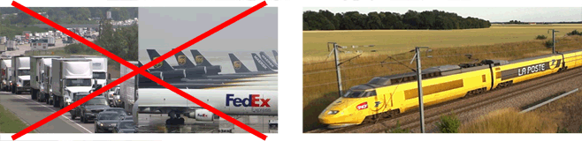 America faces epic problems with its light freight shipping network, made up mostly of long-distance trucks, and airplanes. This shipping system clogs our highways and airways, and has an enormous carbon footprint (and major road surface damage).