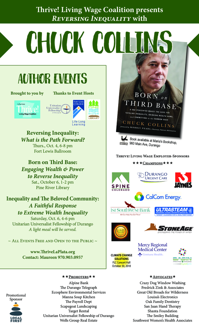 Born on First Base: A One Percenter Makes the Case for Tackling Inequality, Bringing Wealth Home, and Committing to the Common Good, will be presenting three educational programs locally this October. All events are free and open to the public.