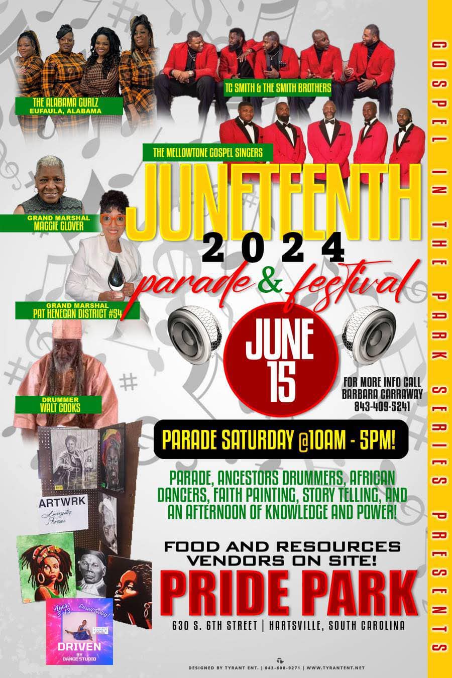 Event includes parade, ancestors drummers, African dancers, faith painting, story telling, and an afternoon of knowledge and power. Parade Grand Marshals will be Maggie Glover and Pat Henegan (District 54). Food and resource vendors will be on site at Pride Park, 630 S. Sixth St., Hartsville. Music by The Alabama Gurlz (Eufala, Ala.), TC Smith & The Smith Brothers, and The Mellowtone Gospel Singers.