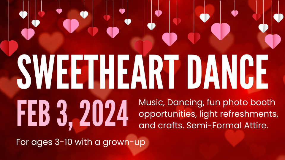 Join us for an enchanting Sweetheart Dance! Enjoy music, dancing, festive photo booth, crafts, and tasty refreshments. Dress up in semi-formal attire and make magical moments with your little ones. $30 Per Couple - Adult and Child, Additional child $15