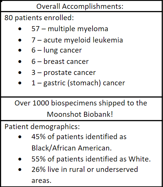 Enjoy snapshots from the Moonshot Engagement Workshop, and our current accruals, patient demographics, and biospecimens!
