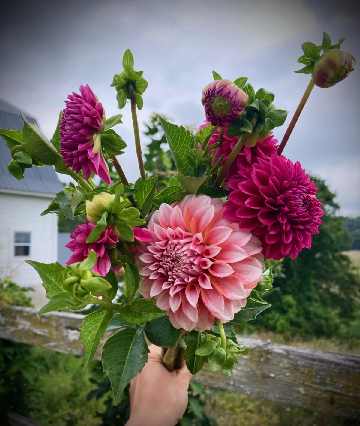 It's a dahlia heavy share this week! They are coming in strong and the hot weather last week really pushed them along! We also have a beautiful basil called "Amathyst" which we planted back in late June and have been wait for it all season! The smell is lovely and the flower buds are Truely striking.