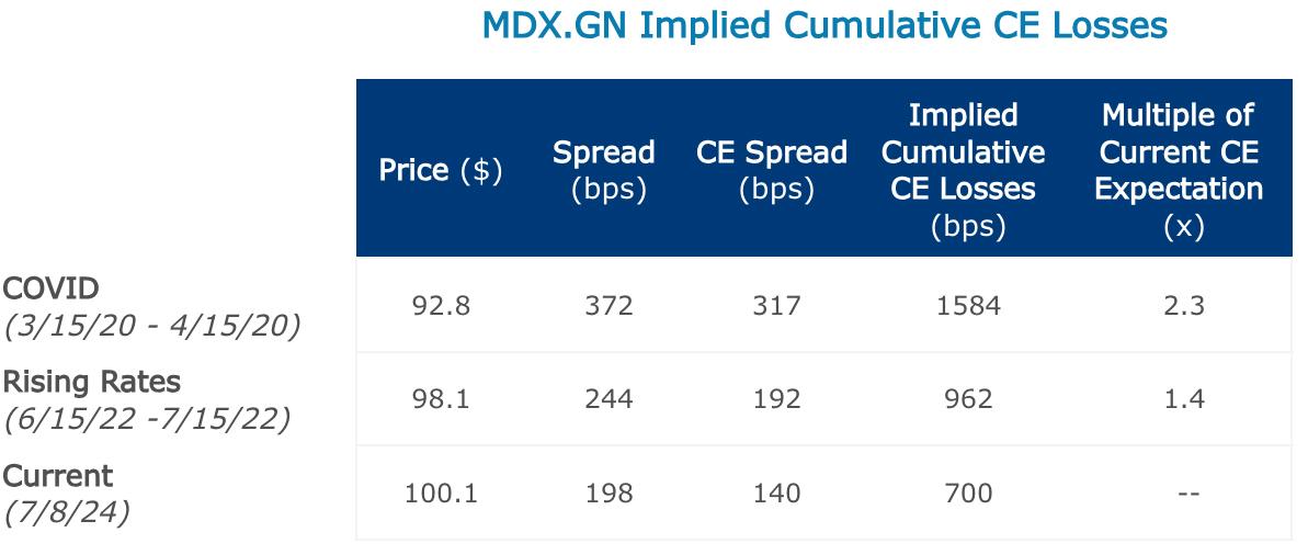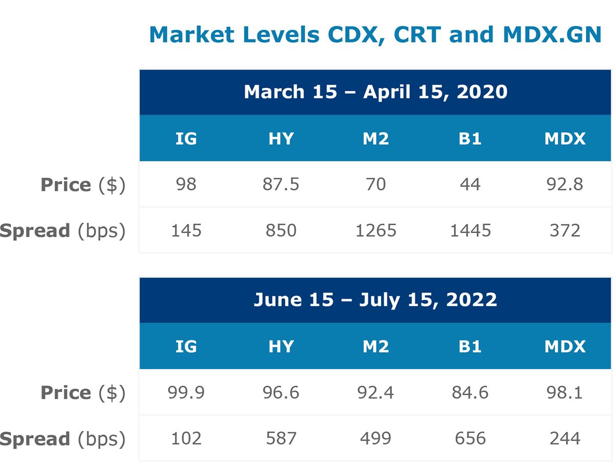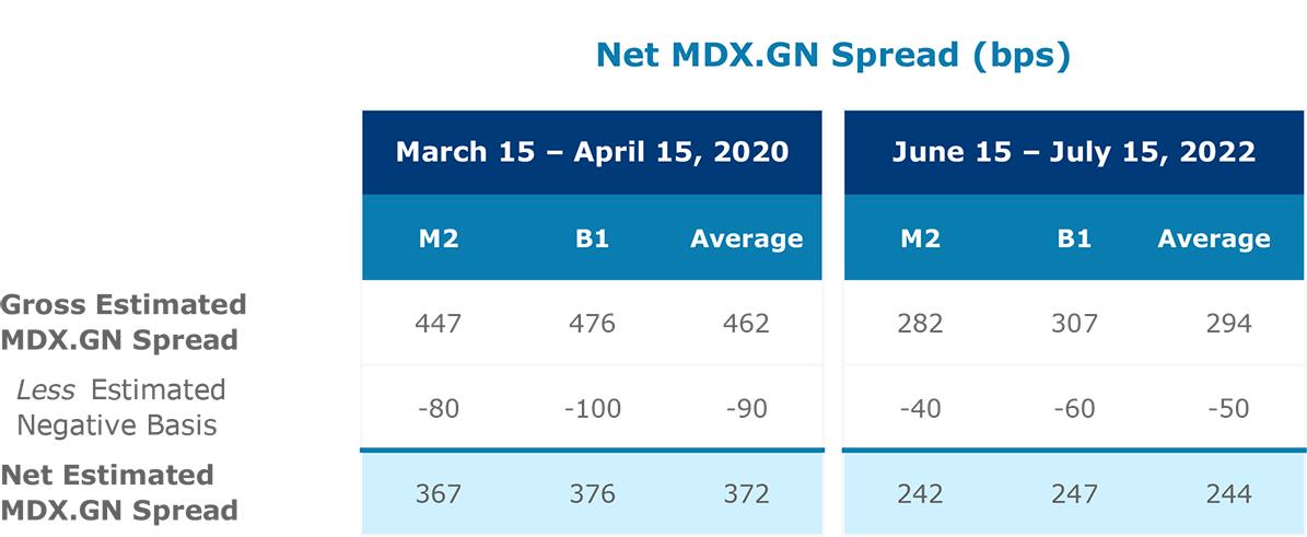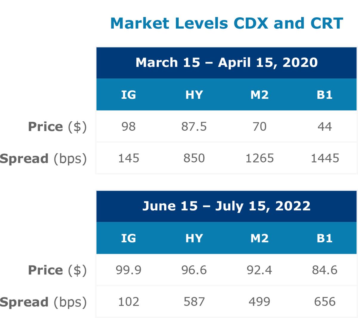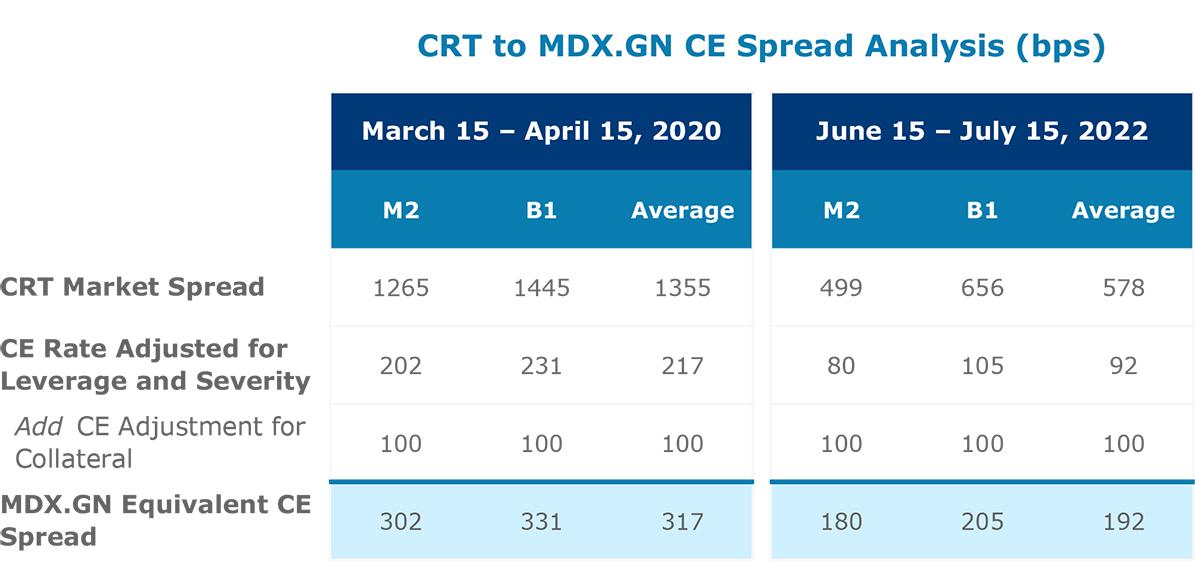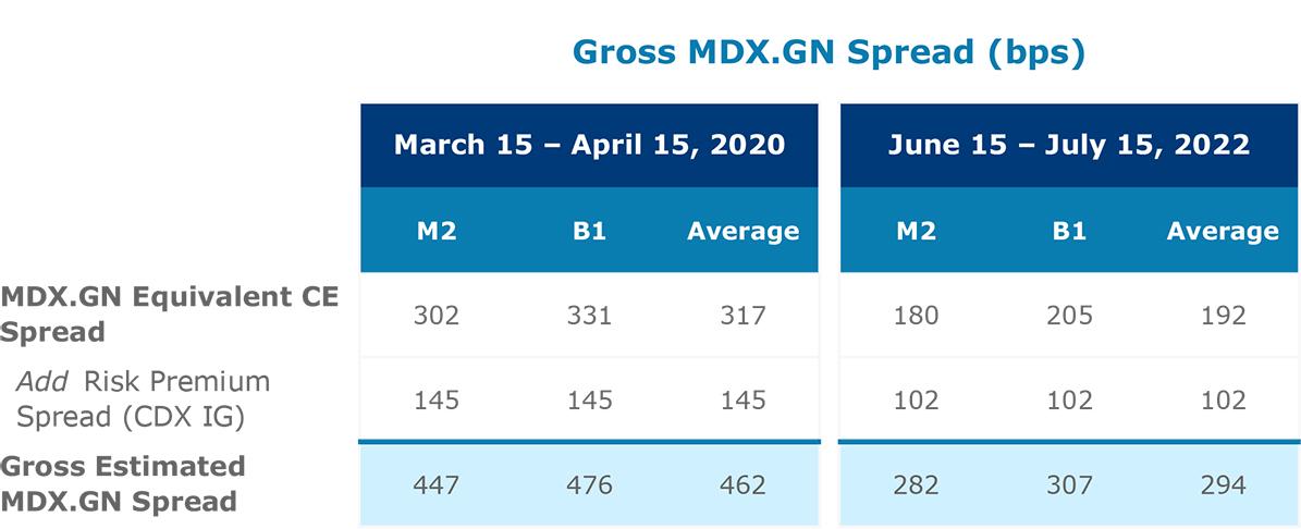 Market Conditions During Early COVID provide a recent test of pricing MDX swaps during an extreme macro stress period. Both CDX and CRT reached their high spreads/low dollar prices between March 15 and April 15, 2020. Meanwhile, the 30 days between June 15 and July 15, 2022, offered an environment for idiosyncratic mortgage stress, as interest rates began to increase rapidly.1 MDX swap pricing can be estimated for these periods using CDX IG and CRT spreads as benchmarks. To accomplish this process, loss-adjusted risk premiums are derived from CDX IG and combined with CRT spreads adjusted for differences in structure, collateral, and funding. All spreads are annual. |