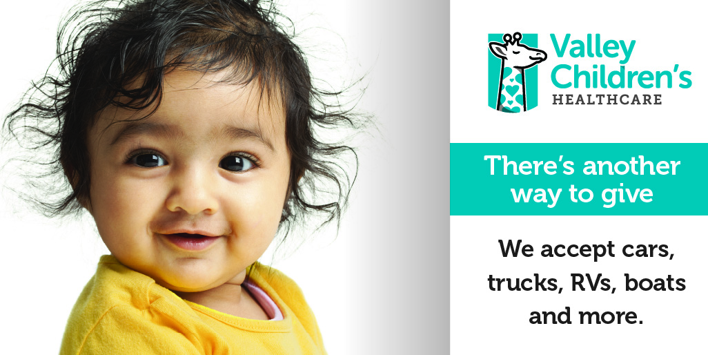 Don’t let your four wheels ruin your next beach day—instead, donate your car, truck, RV, motorcycle or boat to Valley Children’s. We've got you covered with an easy process, free pick-up, and you’ll get those feel-good feelings from giving to a cause you care about. Plus, your donation is tax-deductible! Donate online today or call 844-589-4483, our Vehicle Donation Support team is available seven days a week. | |