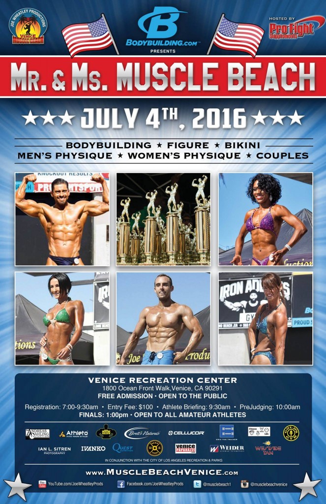 Bodybuilding.com presents the Mr. & Ms. Muscle Beach this Monday July 4, 2016. Hosted by ProFight Sports.