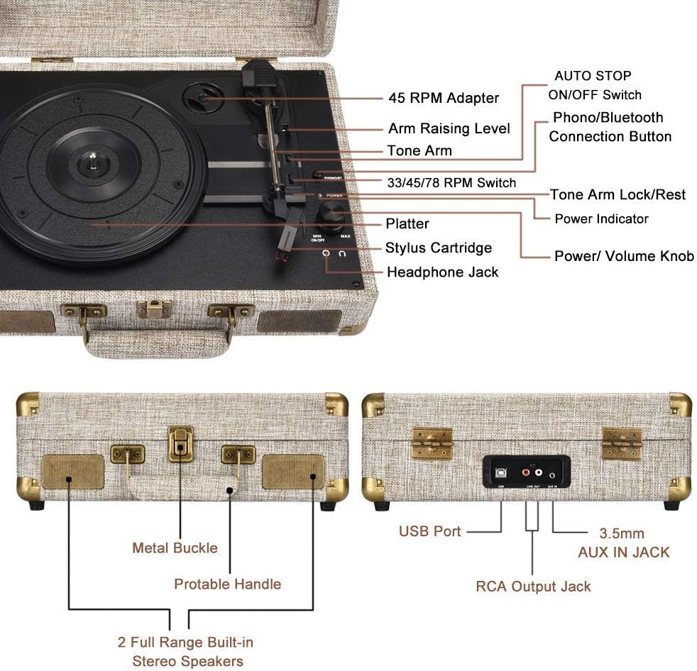 - 3 Speed: 33/45/78 RPM with 7/10/12 inch Vinyl Records