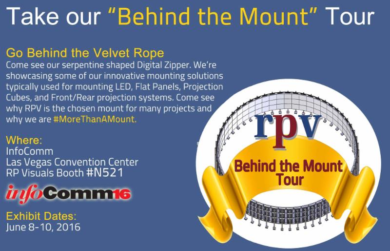 "We decided to resurrect our Mount Hall of Fame again this year. People really get a kick out of seeing what's forbidden, in this case, behind our mounts. This year we've got a serpentine shaped Digital Zipper housing some of our innovative mounting solutions typically used for mounting LED, Flat Panels, Projection Cubes, and Front/Rear projection systems. Come see why RPV is the chosen mount for many projects and why we are #MoreThanAMount. Contact me for your free Exhibit Hall Pass," said Brandy Alvarado, Marketing Manager and Business Development for RPV.