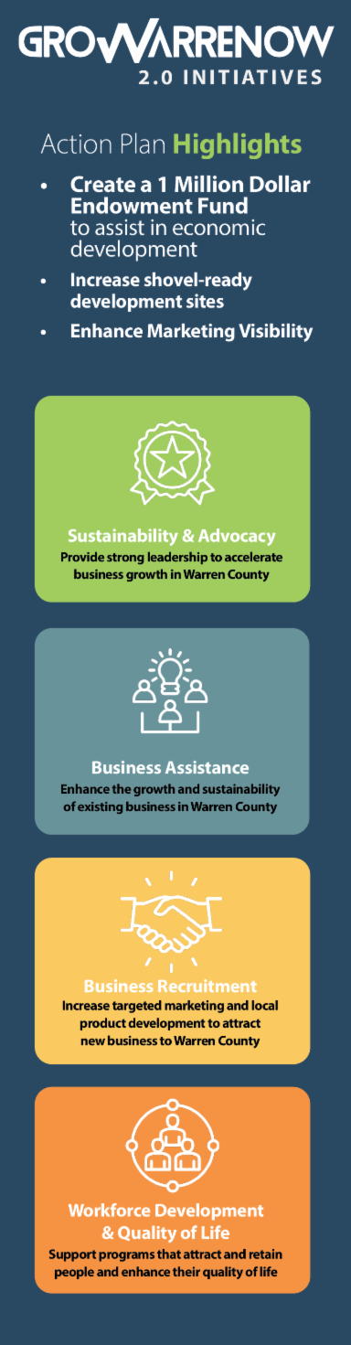 WCEDC is excited to launch GroWARRENow 2.0 a five-year strategic action plan that extends the success of Warren County’s strengths, markets the county’s location advantage and features the assets of the communities within the county to attract, retain and expand businesses. This new five-year program builds off of the growth and momentum with the goal of continuing to increase economic growth and community development for Warren County communities.