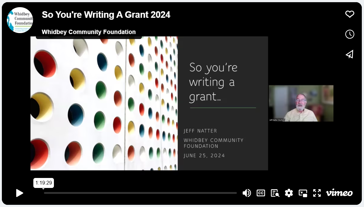 Why do you apply for grants? How can you persuade funders that your program is a good fit for their funding priorities? In this workshop, you’ll learn about grant writing best practices from the perspective of the grant reviewers who will be making decisions about your funding applications. The information provided in this presentation can be applied to all of your competitive grant proposals and not just limited to Whidbey Community Foundation’s grants program. Join WCF and facilitator Jeff Natter for a grant workshop recorded on Zoom.