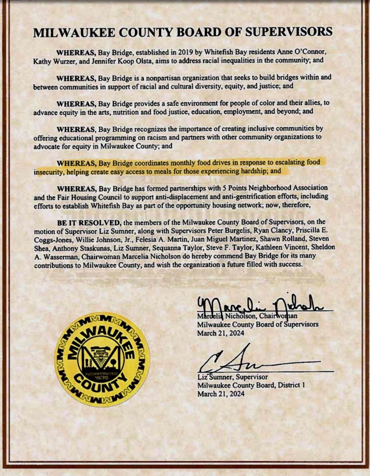 Last week Bay Bridge was honored by Milwaukee County for our/your work in the community including the monthly sandwich drive. As written in the Milwaukee County acknowledgement, Whereas Bay Bridge coordinates monthly food drives in response to escalating food insecurity, helping create easy access to meals for those experiencing hardship;......Be It Resolved, the members of the Milwaukee County Board of Supervisors.....do hereby commend Bay Bridge for its many contributions to Milwaukee County, and wish the organization a future filled with success.