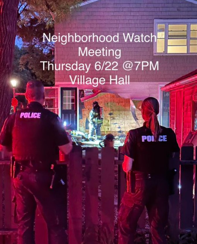 The next Neighborhood Watch meeting will be Thursday, June 22 at 7:00 p.m. in the Village Hall Board Room.