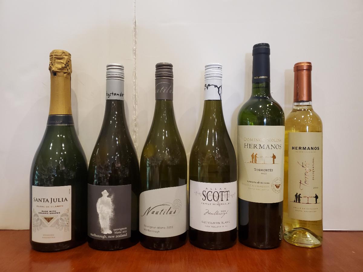 Santa Julia Blanc de Blancs Sparkling Wine (Argentina), 2021 Hermanos Torrentes (Argentina), 2023 Nautilus Sauvignon Blanc (New Zealand), 2022 Innocent Bystander Sauvignon Blanc (New Zealand), 2023 Allan Scott Sauvignon Blanc (New Zealand), 2021 Hermanos Torrentes Dulce Natural (Argentina)