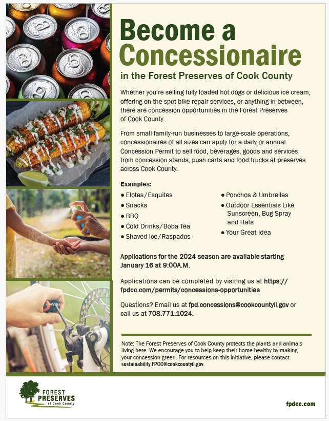 STARTING TUESDAY, JANUARY 16, 2024 at 9:00AM IS OPENING DAY FOR CONCESSIONS PERMITS FOR THE 2024 SEASON IN THE FOREST PRESERVE OF COOK COUNTY!