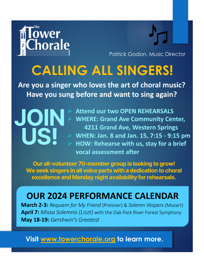 January 8th & 15th- The Tower Chorale Open Rehearsals 7:15-9:15