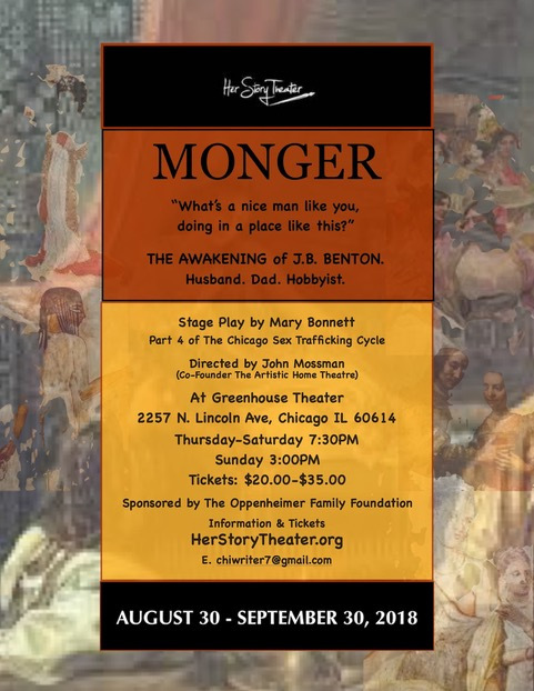 Monger, Part 4 in the Chicago Sex Trafficking Cycle, will open on Thursday, August 30th at the Greenhouse Theater. A percentage of the proceeds from the tickets will go to service organizations that work with sexually exploited women and girls. For tickets and more information, go to the website,