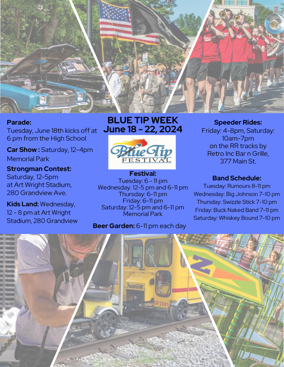 Whether you are new to kayaking or have experience but would like a refresh, we invite you to join us on the water for this learn to kayak program at the Chippewa Yacht Club. Equipment will be available to borrow, but you may choose to bring your own kayak, paddle, and life jacket. A life jacket must be worn during the program. Ages ten to adult. Registration is required. Free. Registerat https://reservations.medinacountyparks.com/programs/. | Blue Tip Festival Car Show, sponsored by Laria Chevrolet Buick, will have 50/50 raffles, door prizes, DJ & more. Free for spectators and $10 entry per car, all makes and models welcome. | | |