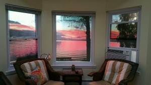 Cathy (images to the right) had a view of an aging wooden fence out her bay window. She replaced that view with a view of a sunset over a lake that she had printed from one of her favorite photographs.