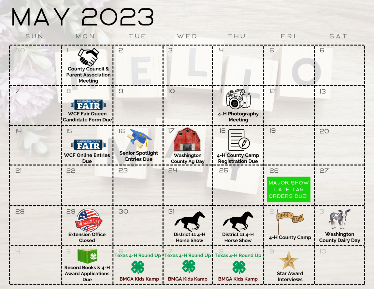 The members of Texas A&M AgriLife will provide equal opportunities in programs and activities, education, and employment to all persons regardless of race, color, sex, religion, national origin, age, disability, genetic information, veteran status, sexual orientation, or gender identity and will strive to achieve full and equal employment opportunity throughout Texas A&M AgriLife. The Texas A&M University System, U.S. Department of Agriculture, and the County Commissioners Courts of Texas Cooperating. Individuals with disabilities who require an auxiliary aid, service or accommodation in order to participate in this meeting are encouraged to contact the County Extension Office at (979) 277-6212 prior to the meeting to determine how reasonable accommodations can be made. | | | | |