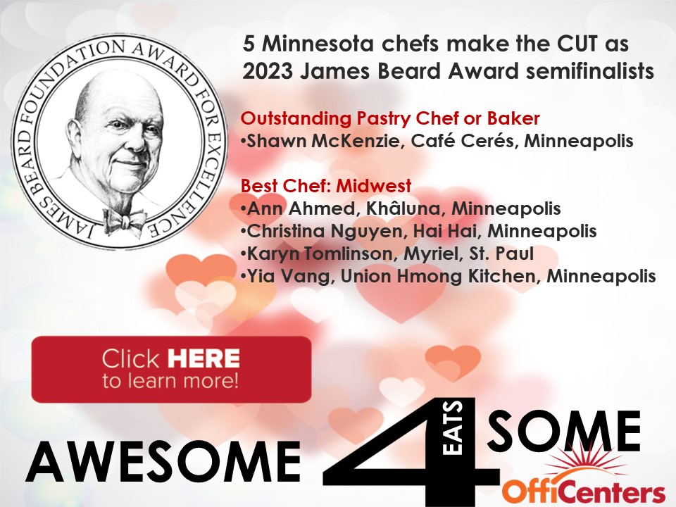 James Beard Awards recognize exceptional talent and achievement in the culinary arts. For a chef to win a James Beard Award is like an actor winning an Oscar. This year, semifinalists for "Best Chef Midwest" is dominated by MN, with four chefs getting the nod and a local pastry chef is nominated for Best Baker/Pastry Chef in the whole darn country. Winners will be awarded on June 5 in Chicago. See a list of MN semifinalists with links to their restaurants, click HERE.