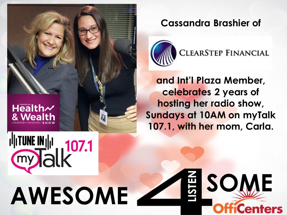 Cassandra Brashier of ClearStep Financial and member at International Plaza, has been doing a weekly radio program on myTalk 107.1 for two years! T une in Sunday mornings at 10AM to the Financial Heath and Wealth Show hosted by financial experts Cassandra and her mother, Carla. Hear them discuss important topics like what to do with an inheritance, 401K rollovers, retirement readiness and income planning. You can listen to past episodes HERE.