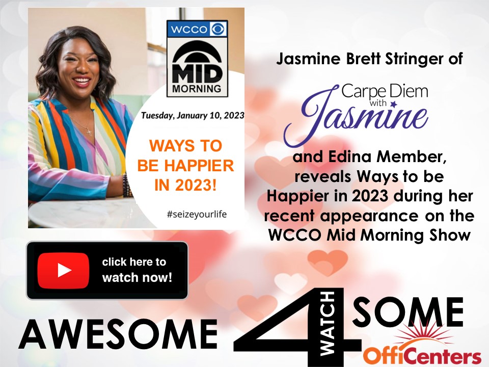 Jasmine Brett Stringer, of Carpe Diem with Jasmine and member at Edina is also the Lifestyle Contributor for WCCO Mid-Morning. Last month Jasmine did segment on ways to be happier in the new year. She shared some easy actions you can take in order to bring more satisfaction to your life based on research by two Harvard University Professors and, of course, her own experiences. You can watch Jasmine's piece and get yourself happy HERE.