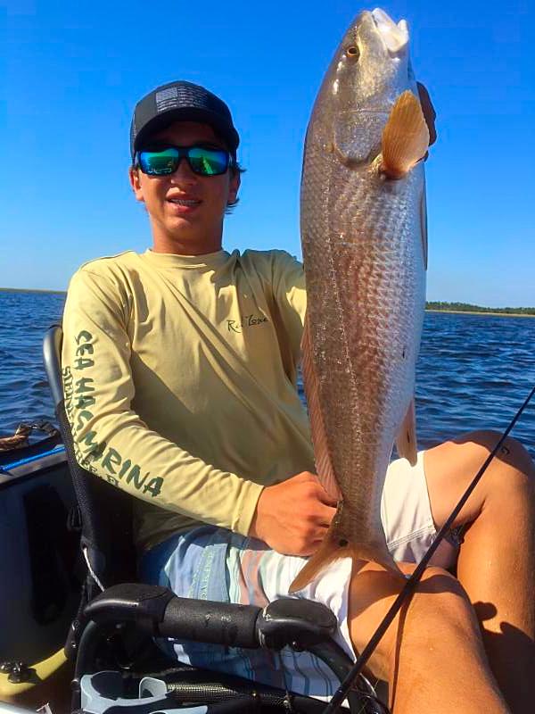 A happy Mother's Day redfish caught on Danielle Norwood's kayak! I was using an 1/8oz jighead with a Gulp GSJS5-PSH Pink Shine 5" Jerk Shad. I was using Chase's Bull Bay #15 Reel Animal Rod and a Shimano Stradic CI4 3000 Series Reel.