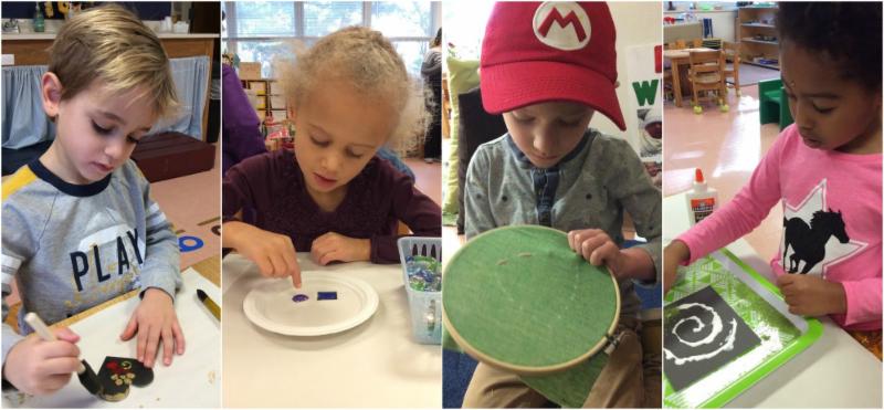 So far this year, children in the Primary program have worked with mosaics, sand labyrinths, Indian block painting and sewing. All of these projects have helped them develop cultural or aesthetic appreciation, and introduced them to ways of using known and unknown materials to create imagery and express themselves. These projects have also encouraged the children to hone their pincer grips, work across the mid-line and develop hand-eye coordination.