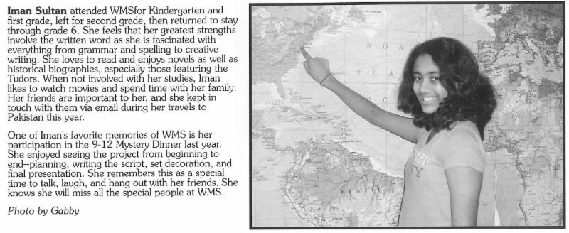 Iman's passion for writing began when she was a student at WMS: "I remember being taught writing and reading at WMS with reading response journals, and keeping a writing notebook for class in the 9-12 Program."