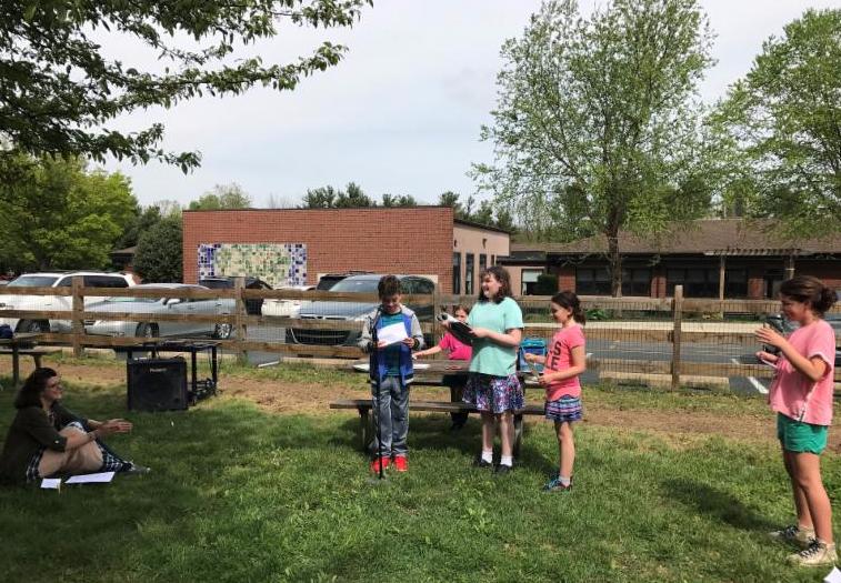 April 27 is Poem in Your Pocket Day , a joyous way to celebrate National Poetry Month. Throughout the day, students surprised staff members by appearing at their office doors and sharing their poems. Short poems, rhyming poetry, poems for two voices, silly and serious poems were shared. After school, anyone who wanted to share a poem was invited to do so in the Peace Park. The line of inspired poets was long. Students from the Elementary Program (and a few Primary students) took the microphone and read their poems to an audience of children and adults. It was delightful.