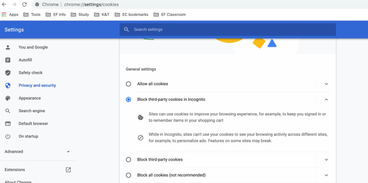 Until this release is confirmed, teachers should use the normal browser mode and check that "Allow all cookies" is selected in Chrome's Privacy and security settings. Here is an example of how to enable cookies in Chrome: