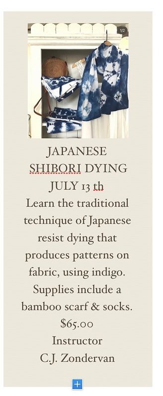 Learn the traditional technique of Japanese resist dying that produces patterns on fabric, using indigo. Supplies include a bamboo scarf & socks.