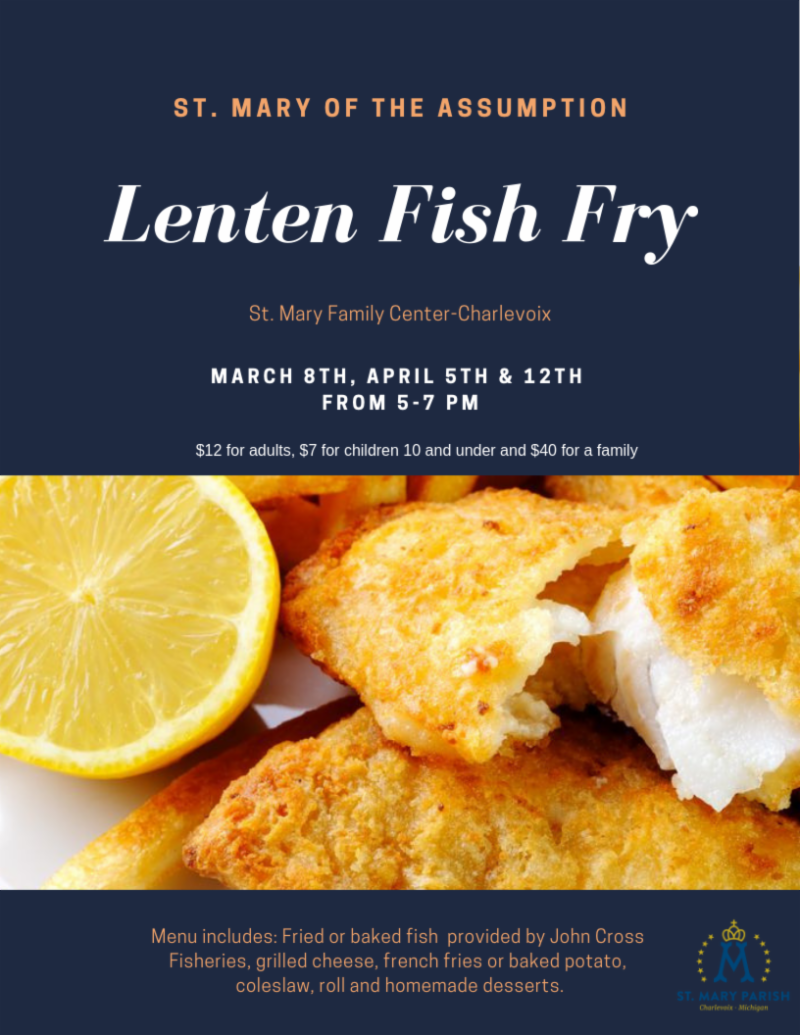 St. Mary will have two more Lenten Fish Fries on April 5th and April 12th. The menu includes: fried or baked fish provided by John Cross Fisheries, grilled cheese, french fries or baked potato, coleslaw, roll and homemade desserts. The cost is $12 for adults, $7 for children 10 and under and $40 for a family.