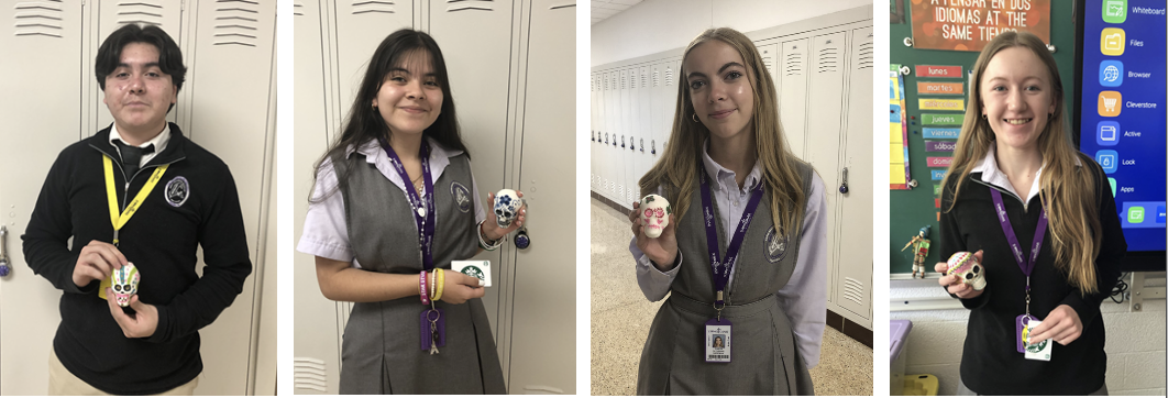 Congratulations to sophomore Luis Jimenez Noyola, freshman Adilene Buitron Rocha, freshman Catherine Hageman, and freshman Veronica Vitullo, all members of the Spanish club, for winning the Sugar Skull competition that was part of our Day of the Dead celebration. | |