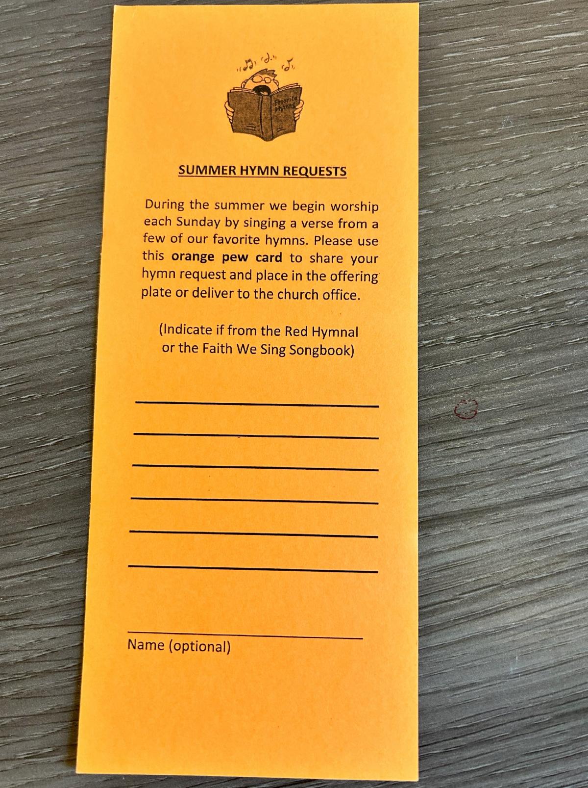 Make your requests on the orange hymn request forms in the pew holders and place in the offering plate, or drop off in the church office. Questions can be sent to scott@genevaumc.org