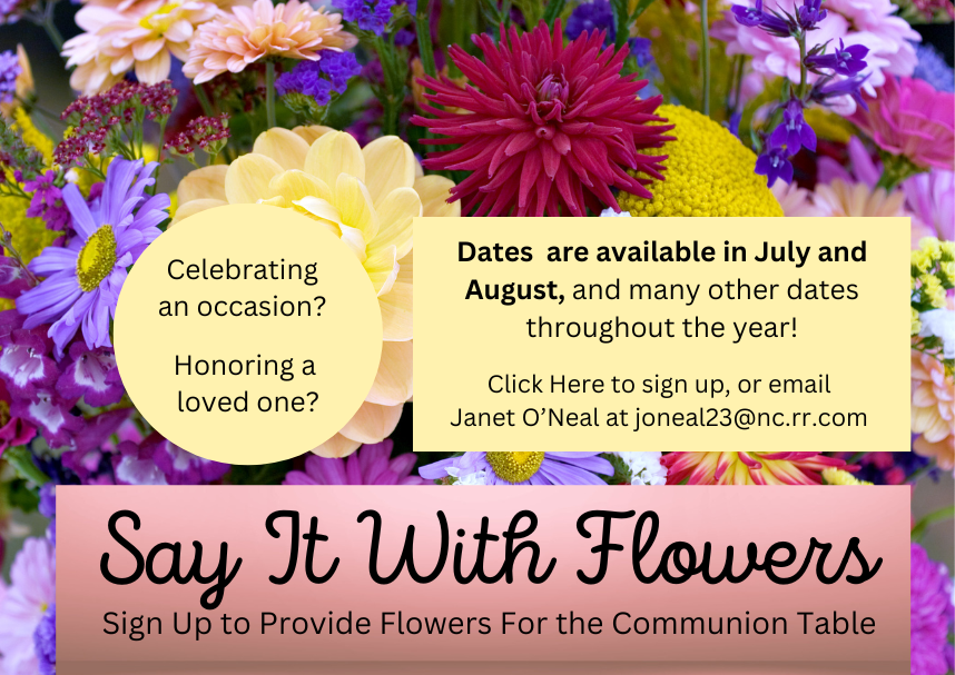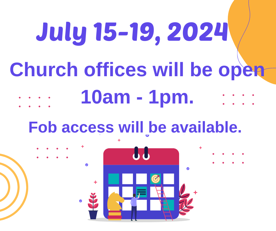 Our Office Manager, Donna Crisp, will be on vacation next week. There will be volunteers covering the office from 10am - 1pm daily while she is away. Office volunteers will pass any messages on to Amy or Marcus if they can't wait until Monday, July 22nd. If you need immediate help, please call the church office (919-942-4964) and leave a message.