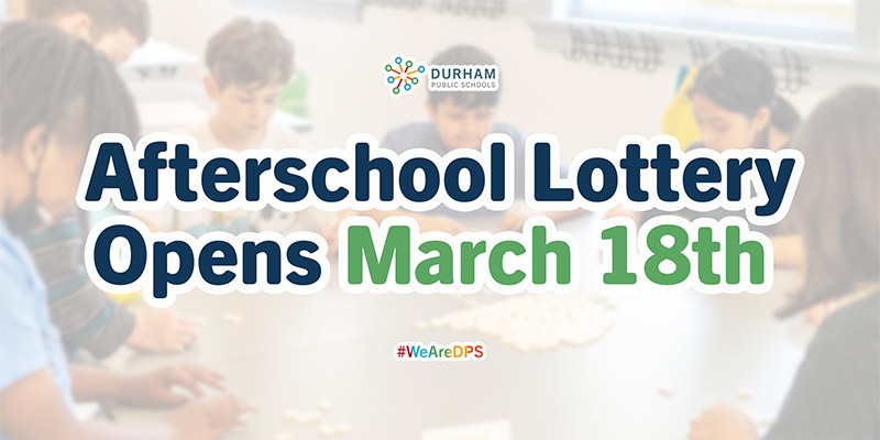 Durham Public Schools Community Education – the department responsible for after-school programming – will conduct a lottery for elementary afterschool programs this year. The lottery opened on Monday, March 18, and will close on April 19 at 5 p.m. Afterschool lottery results will be emailed to families on Friday, May 3.