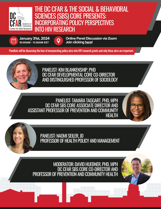 DC CFAR Social and Behavioral Sciences Core Panel: Incorporating Policy Perspectives in HIV Research, Jan 31, 10-11:30AM, via Zoom | |