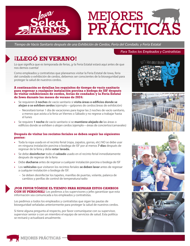 Como empleados y contratistas que planean visitar la Feria Estatal de Iowa, feria del condado o evento de exhibicion de cerdos, necesitaremos estar atentos a la bioseguridad para proteger la salud de nuestros cerdos.