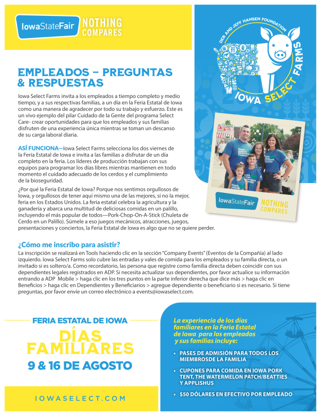 Para mayor información, por favor lea nuestros Q&A de a continuación. Si tiene preguntas o problemas con la inscripción, por favor envíe un correo electrónico a events@iowaselect.com.