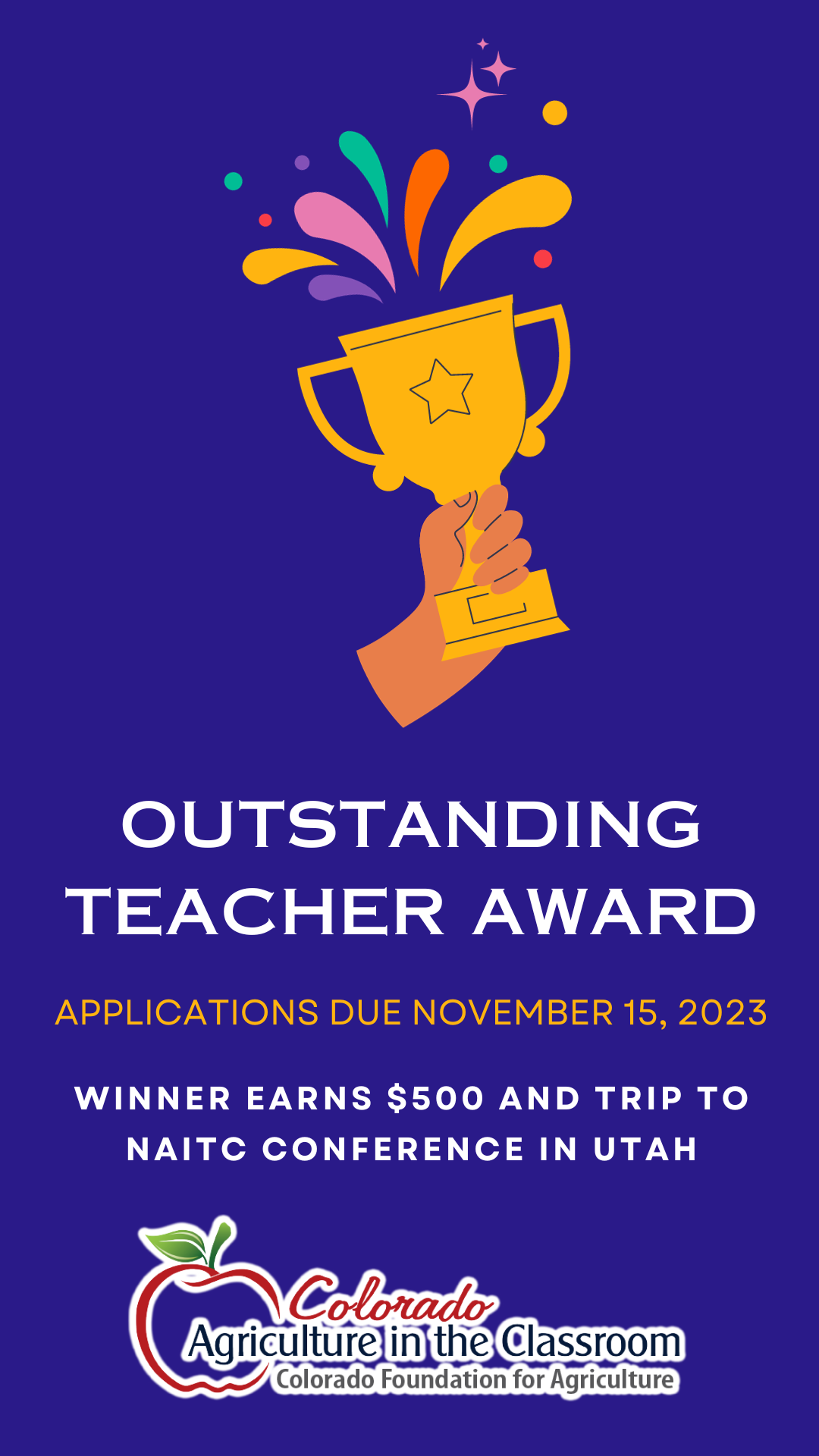 The winning Colorado teacher will receive a $500 monetary award and have up to $1,500 of his or her related expenses paid to attend the National Agriculture in the Classroom (NAITC) Conference June 24-27, 2024 in Salt Lake City, Utah. Please refer to the application for further eligibility and award information.