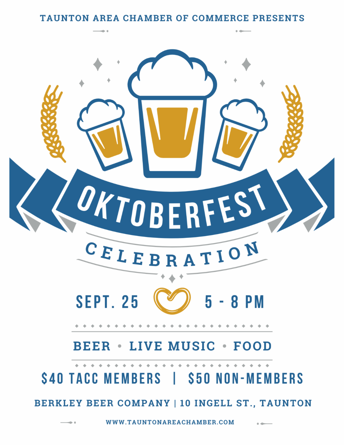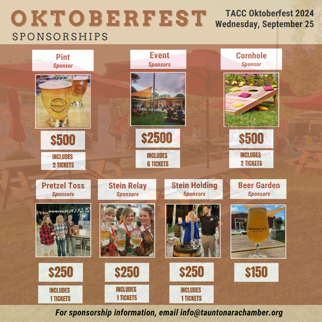 For the first time since we launched our popular Oktoberfest, the $2500 Event Sponsorship is available! If you're interested in having your organization showcased at this event, at any sponsor level, contact Kris at kris@tauntonareachamber.org. | |