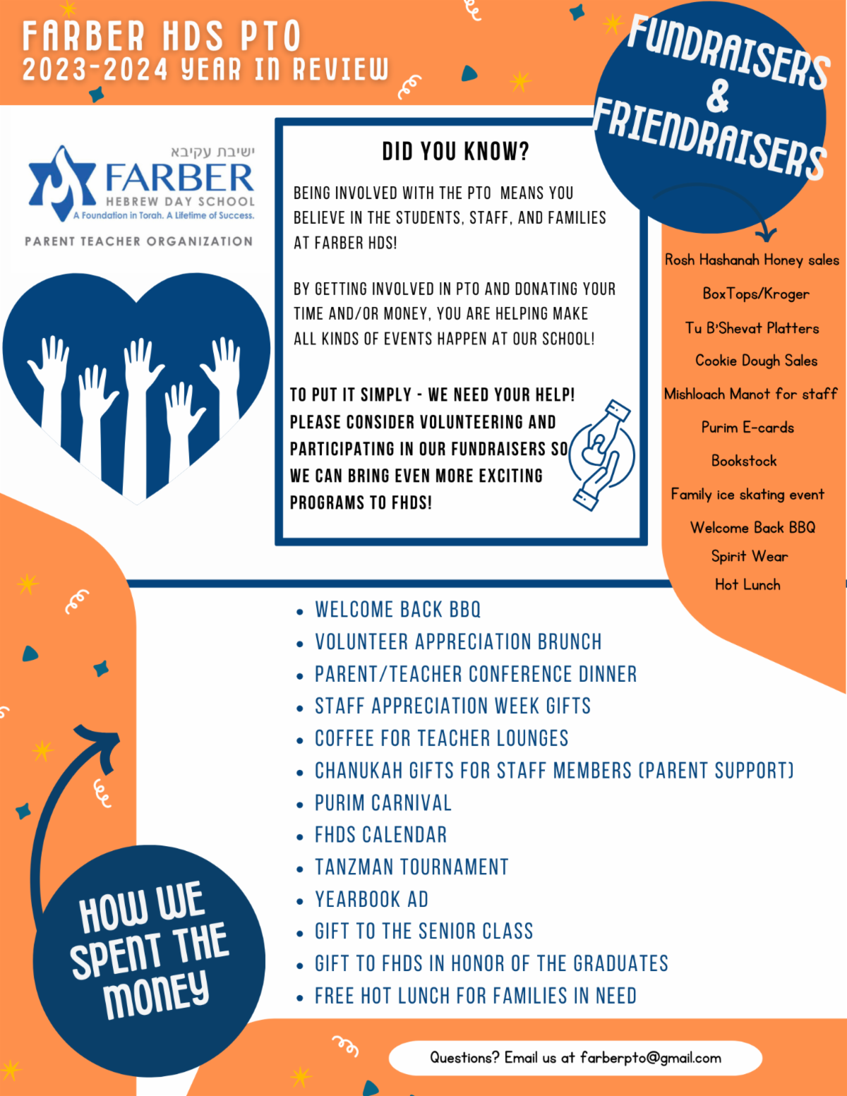 We are so grateful to our calendar co-sponsors this year- Dr. Daniel Gross of Your Smile Orthodontics and the Detroit Economic Gemach- for helping us create and distribute calendars to each of our Farber families. Calendars will be sent home this week with your children. If you would like to purchase additional calendars for family members or friends at $10 per calendar, please contact us at farberpto@gmail.com.
