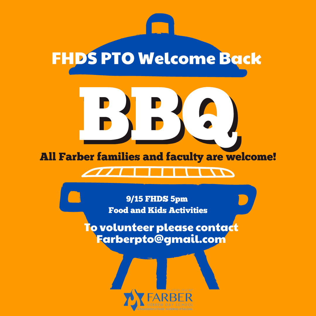 The PTO Welcome Back BBQ will be held on Sunday, September 15th, at 5pm at the school. Join us for some BBQ and family fun, as we reunite with old friends and welcome new additions to our Farber family! We are in need of some volunteers to help with setup, cleanup and grilling. Please contact us at farberpto@gmail.com if you can help out!