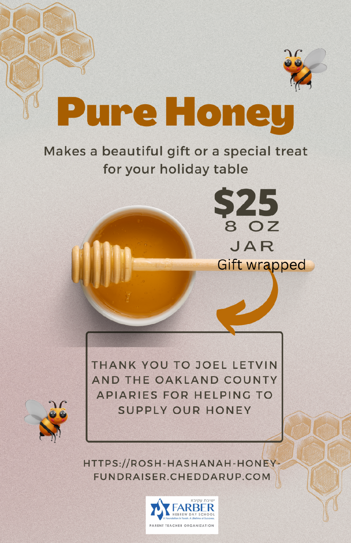 Our first fundraiser of the school year is up and running! We are selling delicious honey for Rosh Hashanah, which is being locally sourced from Joel K. Letvin and the Oakland County Apiaries. Perfect for yourself or as a gift. Each 8oz jar of honey is $25 and all proceeds go to support PTO programming. This is a great opportunity to support the PTO! You can order HERE.