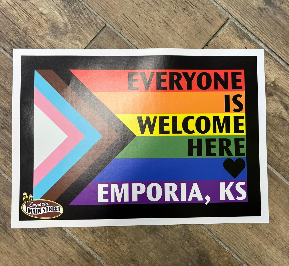 Hey Main Streeters! In celebration of PRIDE month (June) we want to spread good vibes to our community members and visitors! If you would like one of these posters for your business or organization, stop by our office at 727 Commercial Street! The posters are 17x12 and were created in our Fab Lab. No charge - just be a good human! Everyone is Welcome in Emporia! | |