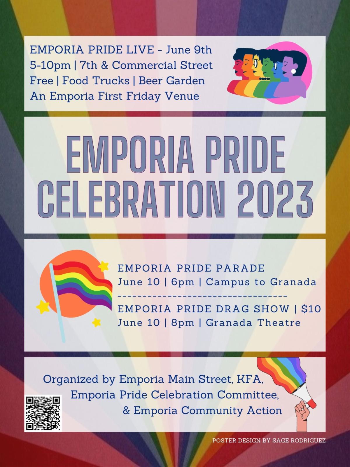 There are several PRIDE activities happening in Emporia this month! For a complete list, visit our website! If you or your organization has an activity to share, please contact the office! | Pride Shirts Now Available at 727 Commercial Street or online at emporiamainstreet.com | |