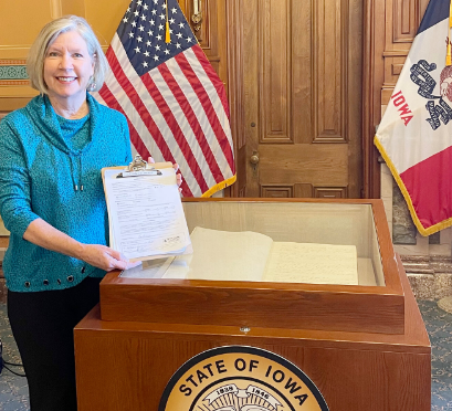 (Above) Kay Pence, Eldridge, shows her candidacy petition at the Iowa Secretary of State's office.