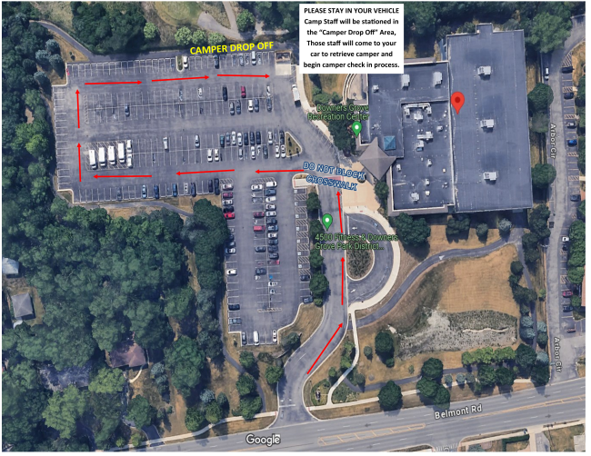 Drop Off: A curbside drop off up will be created (see map below). We ask that parents who are utilizing the curbside drop off remain in their cars, do not block any crosswalks, and wait for camp staff to approach vehicle to retrieve child and get check in process started.